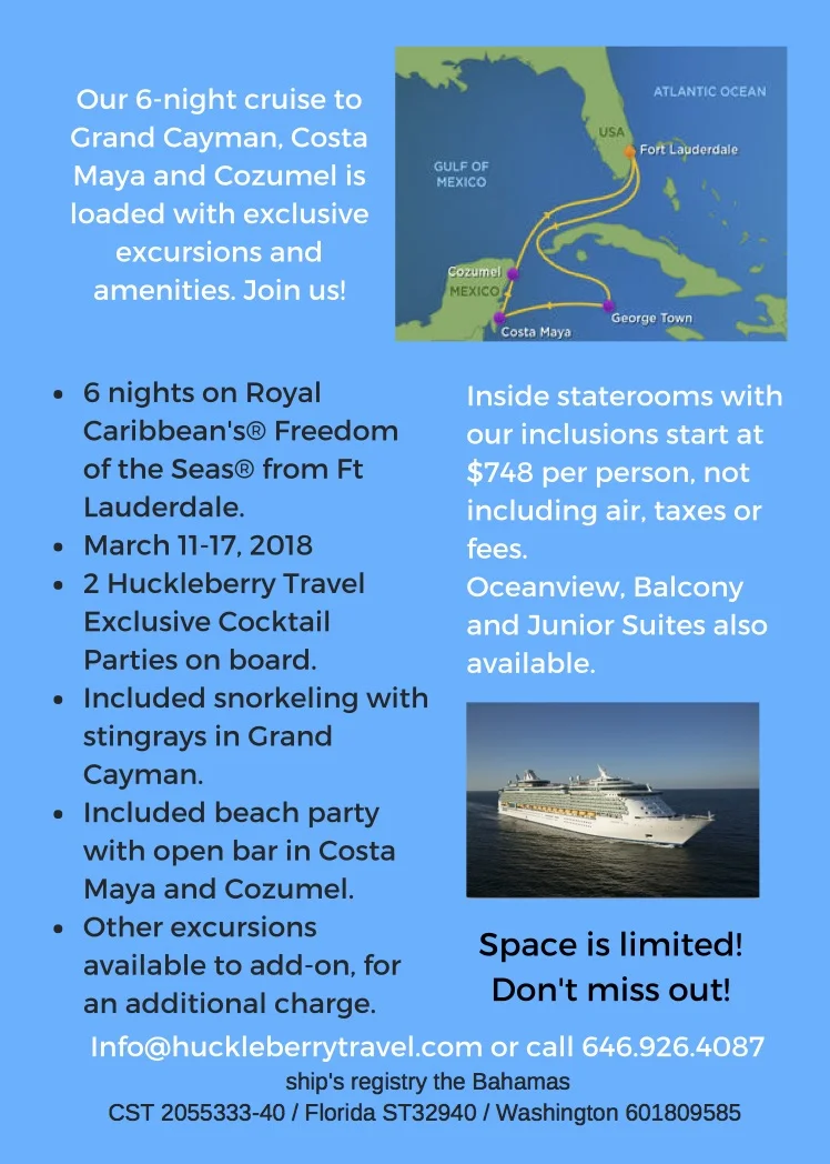 Our trip leaves on March 11 from Ft. Lauderdale on Royal Caribbean's Freedom of the Seas, and returns on March 17. Royal Caribbean has been consistently rated as the top cruise line for Caribbean itineraries, and this particular sailing has special Huckleberry Travel pricing, as well as enhanced amenities. On this six-night itinerary, you'll leave Ft. Lauderdale, stop in Grand Cayman, as well as Costa Maya and Cozumel, both in Mexico. Couple that with a couple of days at sea for spa days, reading by the pool and day-drinking, and you'll get a much-needed dose of warm weather in early March.
